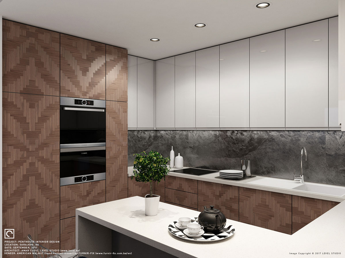 Es handelt sich dabei um ein technisches Furnier in einem trendigen Grauton. Das streifige Furnierbild verdankt diese Holzart seinem Herstellungsprozess. Dabei werden die Stämme geschält und die daraus entstehenden Furniere nach einem Färbeprozess zu einem Block verleimt. Danach wird dieser Block gemessert und es entstehen die fertigen Fineline-Furniere, deren Optik reproduzierbar ist.
