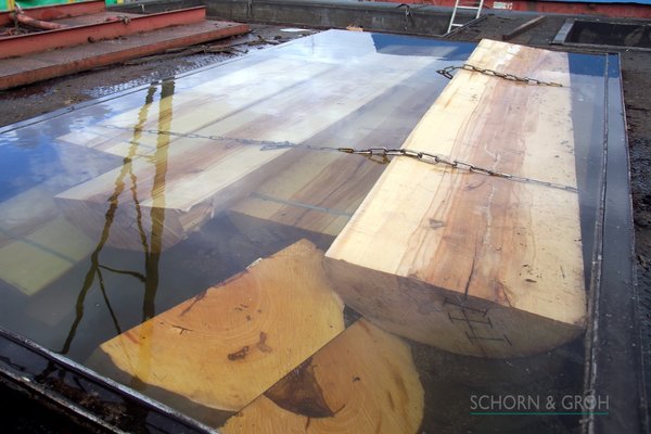 Zum Riftschälen wird der Stamm geviertelt. Der Block wird mit einer der beiden Ebenenseiten auf den Drehbalken gespannt und von der gegenüber liegenden Seite hergeschält.