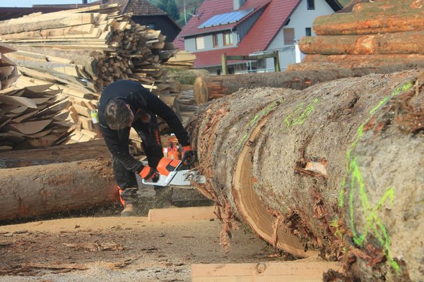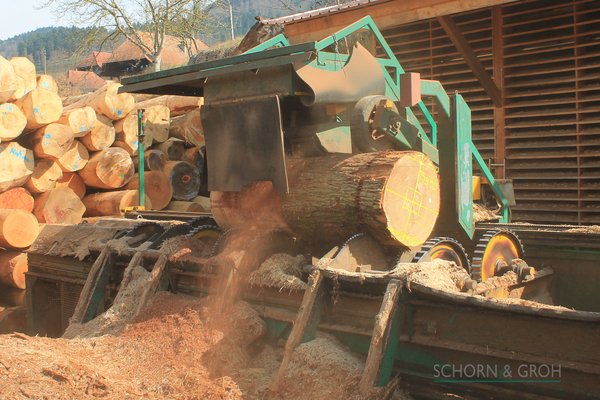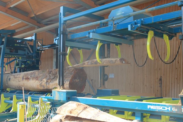 Jeder Stamm wird, je nach Aufarbeitungsart, an der Blockbandsäge zugerichtet.