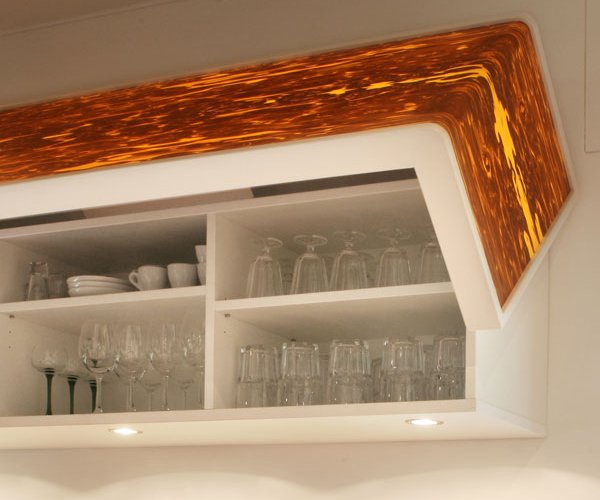 Die originelle Grundidee setzt feinstes Olive-Furnier ins richtige Licht: Das Furnier läuft wie ein breites Band um den Hängeschrank und wird flächig hinterleuchtet. Diese Kombination aus hellem Furnier und warmem Licht lässt den gesamten Hängeschrank wie eine gedämpfte Lampe wirken.