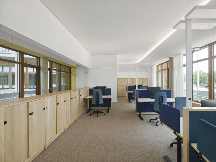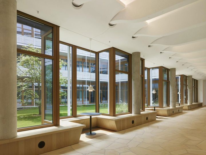 Der wabenförmige Baukörper und das natürliche Licht, dass durch fast 13.000 Quadratmeter Glasflächen fällt, bieten eine angenehme und helle Arbeitsatmosphäre. Sehr besonders sind die acht begrünten Innenhöfe und das intensiv begrünte Parkhausdach, das sogar mit Obstbäumen bepflanzt ist. Solnhofer Steinplatten auf dem Boden im Erdgeschoss, Eichenholz, dezentes Kunstlicht und Kräutergärten in den Höfen sorgen für eine wohnliche und zwanglose Atmosphäre wie man sie sonst in Bürogebäuden eher selten findet. Üppige Treppenhäuser und ein Farbleitsystem bieten in dem etwas labyrinthischen System Orientierung.