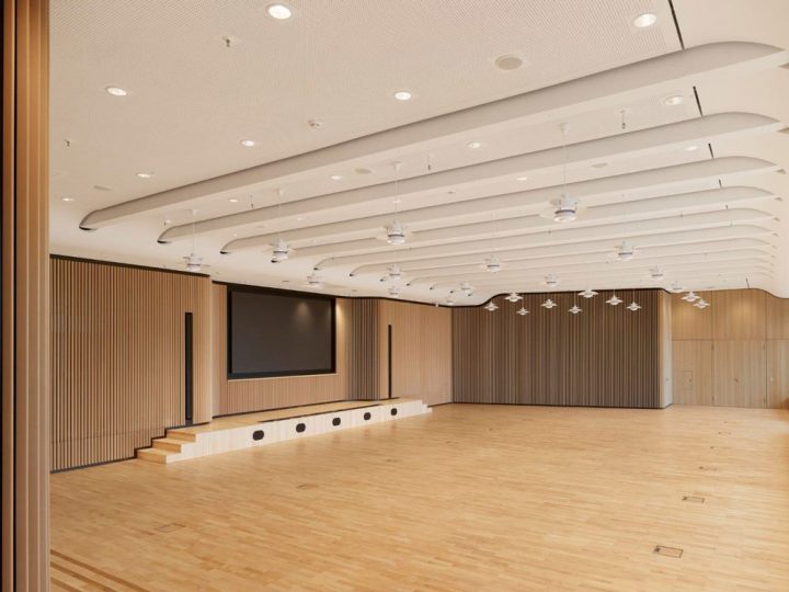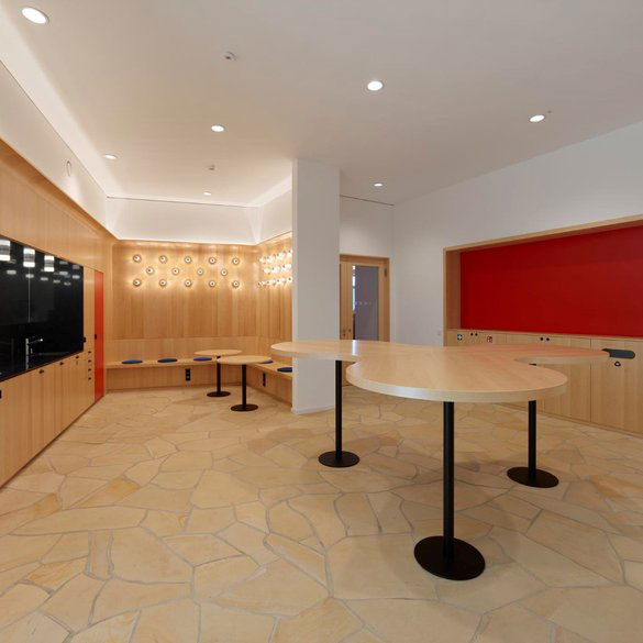 Über 13.500 m² hochwertiger Echtholzfurniere wurden insgesamt verbaut, davon 11.500 m² in der Standardstärke von 0,6 mm und 2.000 m² mit 1,0 mm Stärke. Beide Furnierstärken stammen aus denselben Wuchsgebieten und sorgen für das homogene Gesamtbild bei Wandverkleidungen, Türen und eingebauten Möbeln. Schorn & Groh produzierte die Furniere selbst als zusammengesetzte Fixmaße in geplankter Optik in seiner Eschelbronner Filiale. Die Furnierauswahl, die Weiterverarbeitung und der Einbau fanden in enger Zusammenarbeit mit der Lindner AG und der Friedrich Hanselmann GmbH statt. Lindner fertigte die Wandverkleidungen und Türen, Hanselmann die Möbelstücke für die Aufenthaltsräume und den Teeküchenbereich.