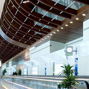 Bei der Erweiterung des Dubai International Airport wurde Nussbaum-Furnier auf spektakuläre Art und Weise in Szene gesetzt: Es veredelt die innenliegenden Fassadenelemente des neuen Airport-Hotels.
