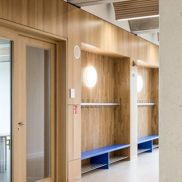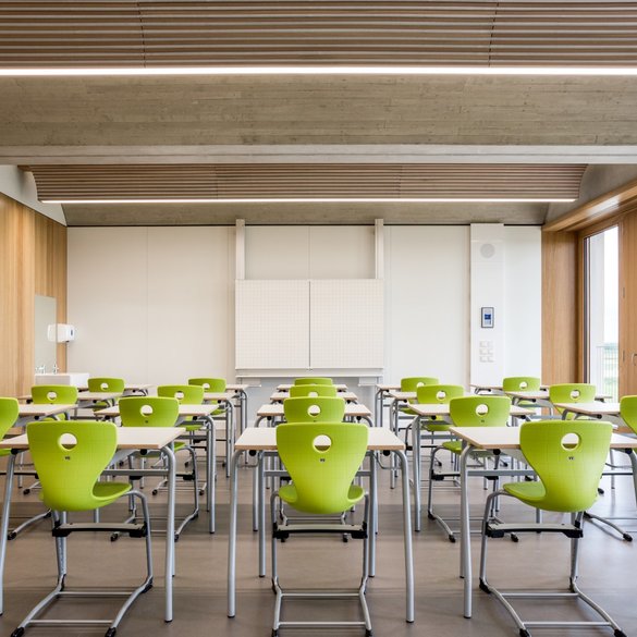 Auffallend ist die gute Akustik. Es hallt nicht, wenn die Schüler durch die Flure toben, und in den Unterrichtsräumen ist Sprache optimal zu hören und zu verstehen. Hierfür wurden zahlreiche Deckensegel und schallabsorbierende Akustik-Paneele aus Furnier verbaut. Die Wandverkleidungen aus Echtholz strahlen Ruhe und Wärme aus und bilden einen farblichen Akzent zu den weiß gestrichenen Wänden. Besonders ist auch die Tonnendecke, die für eine besondere Atmosphäre in den Räumen sorgt. Die Akustik und Raum AG stattete die Schule mit den neuen hochabsorbierenden FeinMicro perforierten Akustikpaneelen aus. Der Furnierspezialist Schorn & Groh aus Karlsruhe lieferte das hochwertige Eichenfurnier als Fixmaß, zusammengesetzt in geplankter Optik. Insgesamt wurden rund 5.400 m² FeinMicroperforierte Akustikwandschalen in Eiche, unifarben lackiert in vier Schulen verbaut.