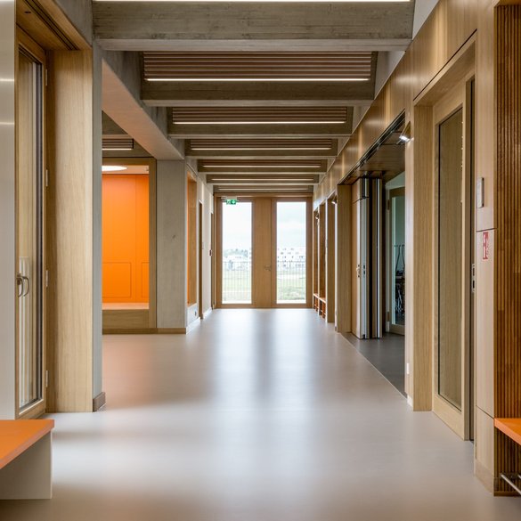 Die Schule ist ein intelligentes Gegenstück zu den seelenlosen Lehranstalten, die fast jeder noch aus seiner Schulzeit kennt. Es ist eine vielfältige zweite Heimat für Kinder von 6 bis 10 Jahren, die den ganzen Tag in der Schule verbringen: Bodentiefe Fenster lassen viel Licht in die Räume. Vor den Fenstern liegen umlaufende Balkone, die als Fluchtwege dienen und die die Schüler zudem nutzen können, um an die frische Luft zu gehen. Lichthöfe sorgen für noch mehr Helligkeit.