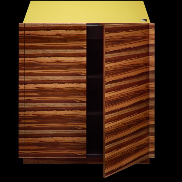 Das einfache und geniale Möbel ist die neueste Entwicklung der Sarah Maier collection. Sarah Maier, die Architektin, Möbeldesignerin und Inhaberin einer 104 Jahre alten Schreinerei bei Stuttgart, ist bekannt dafür, außergewöhnliche Furniere mit farbenfrohen weiteren Materialien zu bedingungslos praktischen Möbeln zu kombinieren.
