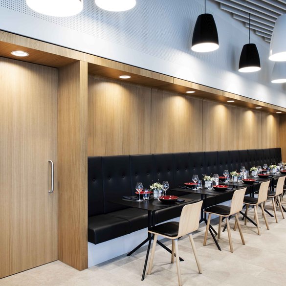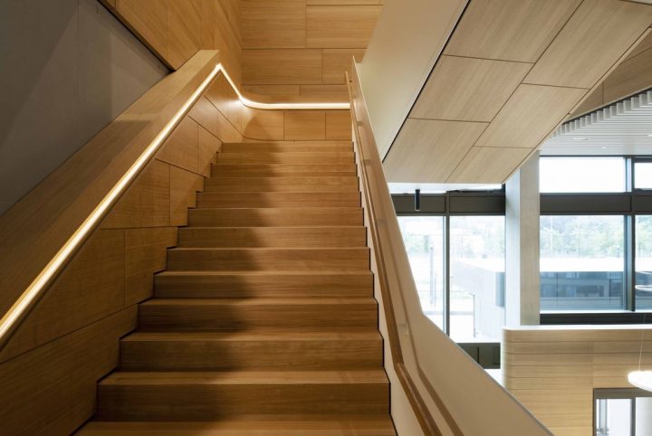 Überaus gelungen ist die Atmosphäre des Gebäudes: Zahlreiche Ruheoasen bieten ihre Plätze an und laden dazu ein, sich niederzulassen und in Dokumente einzutauchen. Viel Licht, hochwertiges Furnier und die Landesfarben blau, weiß und rot bilden den optischen Rahmen. Der warme und freundliche Charakter wird unterstrichen durch das prominent eingesetzte Eichenfurnier, das Decken, Wände, Treppen und Möbel üppig ziert. Rund 1.000 m² lieferte Schorn & Groh, der Karlsruher Furnierspezialist für hochwertige Wandverkleidungen.