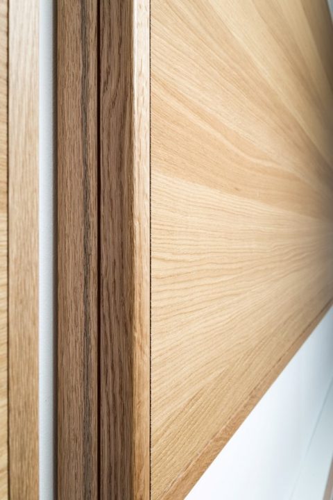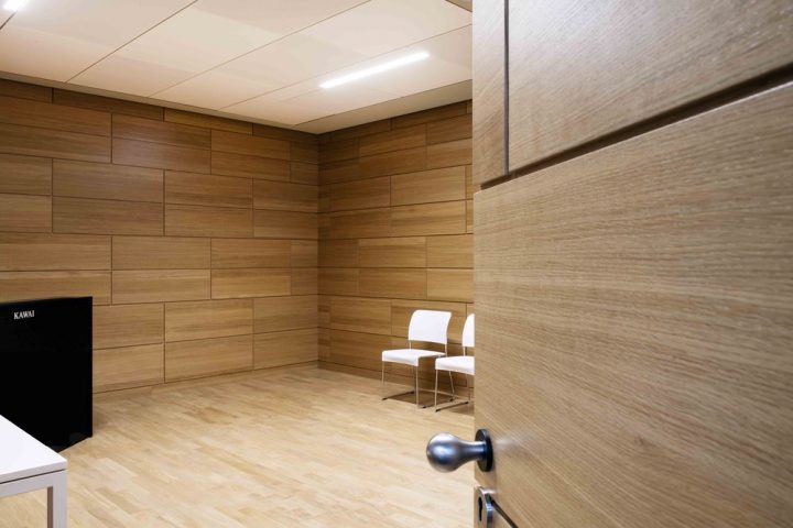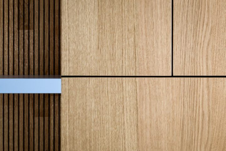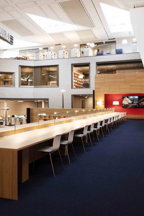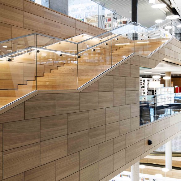 Die Wahl fiel auf die einfach zu verarbeitende Produktvariante FLEX mit stabilisierender Vliesrückseite. FLEX wird von Schorn & Groh im süddeutschen Eschelbronn aus Rohfurnier hergestellt und ist in mehr als 140 Holzarten erhältlich, sowie in zahlreichen Fügetechniken und in individuellen Formaten. Es ist je nach Wunsch bereits vorgeschliffen und/oder geflext. Eine Perforierung im Furnier sorgt für die angenehme Akustik, die für eine Bibliothek wesentlich ist. Die Produktion der fertigen Wandverkleidung als Feinmikroelemente (FM300µm) wurde von der Akustik & Raum AG übernommen. Auch den Einbau der Elemente übernahm das Schweizer Unternehmen aus Olten, das regelmäßig mit Schorn & Groh partnerschaftlich zusammenarbeitet. Die gelungene Innenausstattung der Luxemburgischen Nationalbibliothek wurde vorab mit Hilfe eines Musterzimmers getestet, optimiert und von den Bauherren freigegeben.
