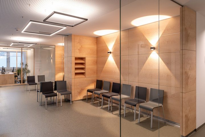 In der Klinik ist die Empfangstheke mit drei Arbeitsplätzen Visitenkarte und Zentrum der Praxis zugleich. Die gewinkelte Thekenkonstruktion ist furniert. Die Arbeitsplatten sind aus massivem Ahorn gefertigt, der farblich mit dem Furnier harmoniert. Für die dynamische Lichtplanung zeichnet die Freiburgerin Andrea von Malm verantwortlich. Auf der Basis der Innenausbauplanungen entwickelte die Lichtplanerin ein kreatives Konzept, dass den unterschiedlichen Raumnutzungen gerecht wird. Alles passt zusammen bei diesem Umbau: Lichtkonzept, Mobiliar und Oberflächen bilden eine überaus gelungene Einheit, die sofort spür- und sichtbar ist. Und die Wahl von kanadischem Ahorn als tonangebende Oberfläche hätte dabei nicht besser sein können.