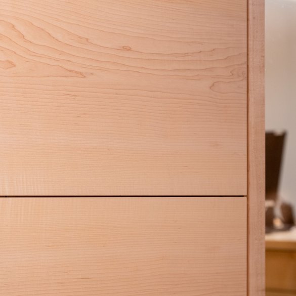 Die Anforderungen der Schreinerei an das gelieferte Holz waren schon zu Beginn der Planungen konkret und anspruchsvoll: Markus Brunner wünschte, dass alle Holzoberflächen eine helle und freundliche Atmosphäre erzeugen, das Furnier eine Länge von mindestens 305cm und eine Mindestbreite von 44cm aufweist. Das Furnierblatt sollte gestürzt werden – das heißt, nur einmal geschlagen – und die Zeichnung des Furniers sich über den gesamten Raum durchziehen. Zudem sollte das Massivholz dem ausgewählten Furnier farblich stark ähneln. Unter Berücksichtigung des Gestaltungskonzepts fiel die Wahl schließlich auf den kanadischen Ahorn. Die gewünschten Furniermaße sind für diese Ahorn-Art nichts Ungewöhnliches. Doch einen Stamm zu finden, der alle gestellten Kunden-Anforderungen erfüllt und der genau diese Breiten aufweist, war eine Herausforderung. Dank des großen Furnier- und Schnittholzlagers des Karlsruher Spezialisten gelang dies ohne Probleme. Da viele Holzarten, die von Schorn & Groh verarbeitet werden, aus denselben Wuchsgebieten stammen, passen zudem Furnier und Massivholz farblich optimal zusammen.