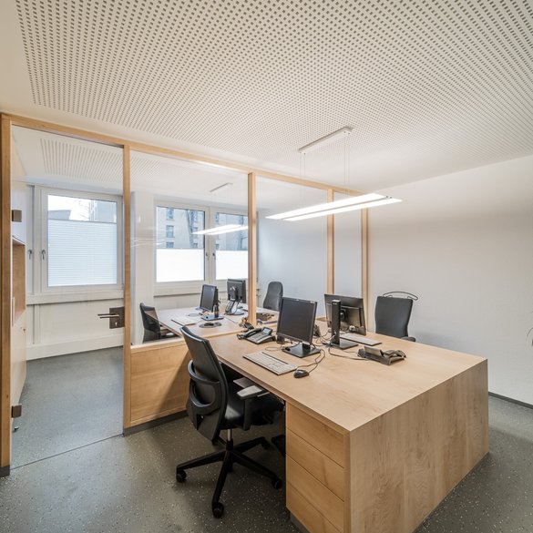 Überall findet sich das dekorative Holz in der neu gestalteten Praxisklinik: Raumhohe Schrankeinbauten hinter der Theke sind Raumteiler und Aktenschränke zugleich. Die verglasten Trennwände lagern auf schlanken Rahmenprofilen aus massivem Ahorn und bringen Tageslicht in die tiefen Räume. In den Funktions- und Röntgenräumen der Praxis schaffen in Ahorn furnierte Wandvertäfelungen eine wohnliche Atmosphäre. Sogar die Schreibtische und Schreibcontainer sind aus Ahorn gefertigt.