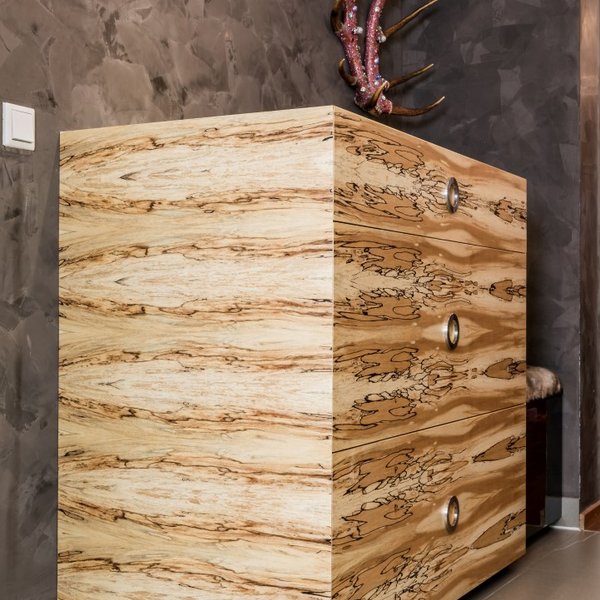 Die Verarbeitung der Vintage Beech erfordert besondere Handwerkskunst, da das Furnier vergleichbar spröde und fragil ist – und besonders behutsam behandelt werden muss. Für das Sideboard hat die Möbelmanufaktur BLEIER LEBENSRÄUME Furniere verwendet, die durch ihre besonders starke Zeichnung überzeugen. Das Rundholz für dieses einzigartige Furnier stammt von einer alten Buche aus Oberwolfach im Schwarzwald.