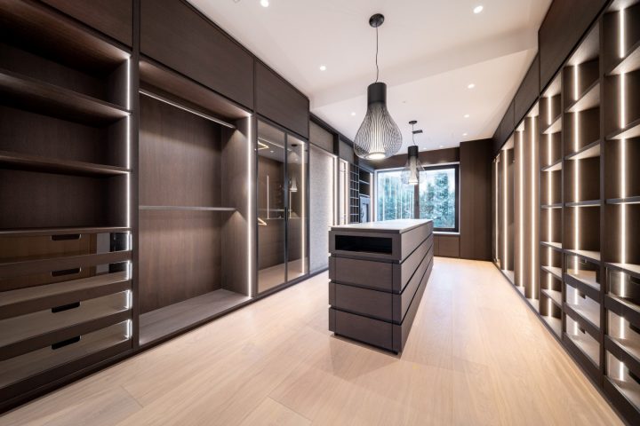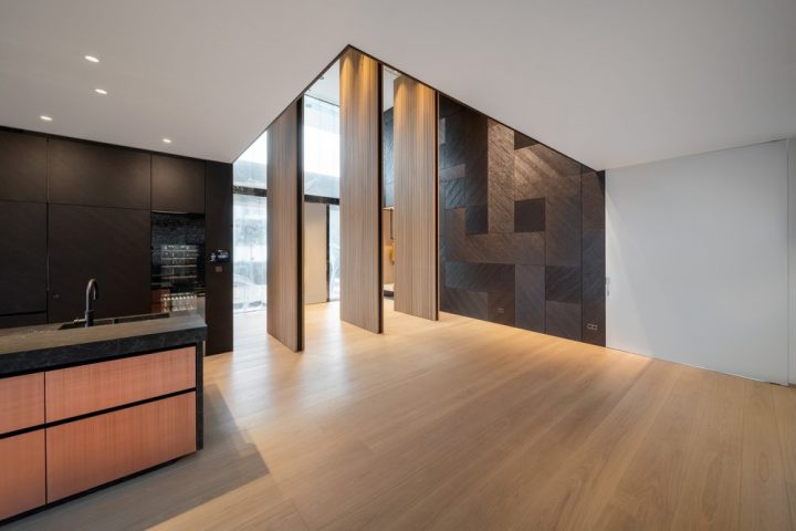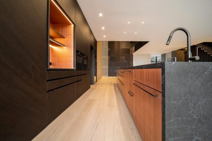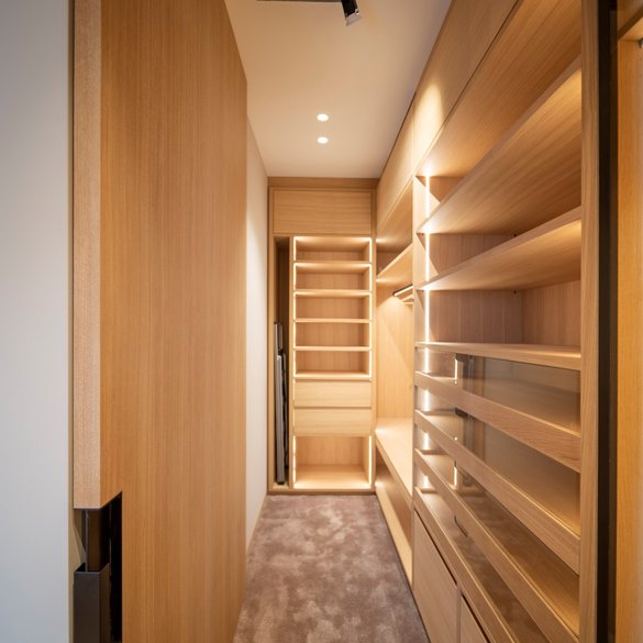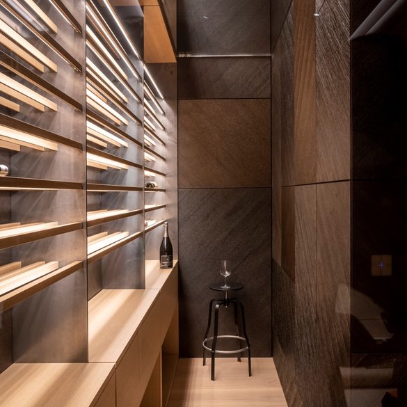 Der Spannungsbogen der vom Architekten geplanten Eichenfurniere, Farben und Holzstrukturen war beeindruckend. Doch mit dem Karlsruher Furnierspezialisten Schorn & Groh saß Martin Fuchs direkt an der Quelle: Dreiviertel der eingesetzten Eichenfurniere stammen aus dem schier unermesslichen Lager des süddeutschen Furnierlieferanten. Während Fuchs sämtliches Mobiliar im Dachgeschoss, im zweiten Untergeschoss und Teilen des Obergeschosses fertigte, übernahm MTB neben den 6 m hohen Pivottüren und beeindruckenden Wandverkleidungen im Erdgeschoss auch die Küchenfronten, Bäder, Kinderzimmer und den Ausbau des Wohnzimmers.