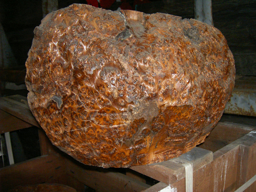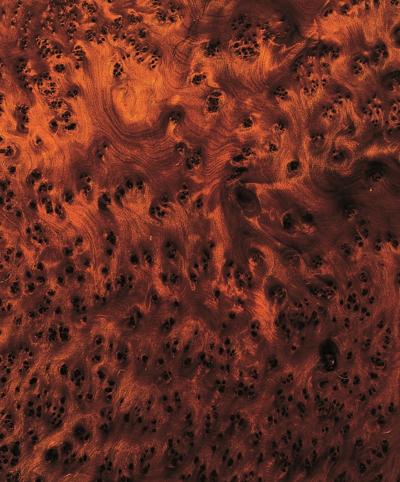 Die Thuja Wurzelmaserknolle ergibt ein bewegtes Furnierbild durch sehr zahlreiche in unregelmäßigen Gruppen angeordnete Maserkerne. Dieses bewegte Bild ist mit seinem intensiv rotbraun-changierenden Farbton ein echter Blickfang. Aufgrund der nur kleinflächigen Dimensionen wird das Furnier als dekorativer Höhepunkt im exklusiven Möbelbau verwendet.